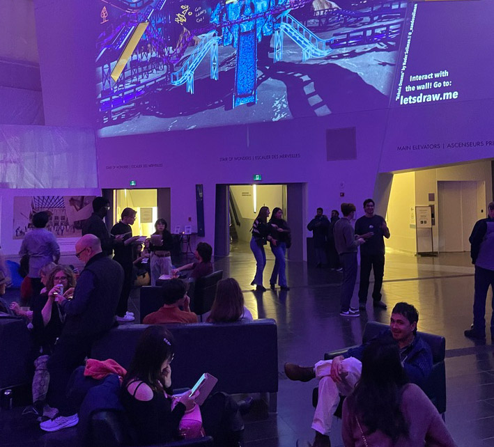 Pendant trois mois, Maxime Touroute a supervisé une résidence hybride avec sept étudiants de l’OCAD University. Ensemble, ils ont conçu sept mappings vidéo originaux, alliant innovation technique et vision artistique. Ce travail collaboratif a été présenté lors de deux moments phares : une soirée au Royal Ontario Museum, dans le cadre du ROM After Dark, et une vitrine à l’OCAD University, qui a attiré près de 2 000 visiteurs. Parmi eux, 750 participants ont interagi avec les œuvres et contribué à la création de plus de 2 000 animations personnalisées, témoignant de l’intérêt du public pour les expériences immersives.